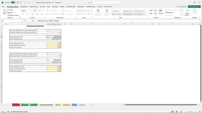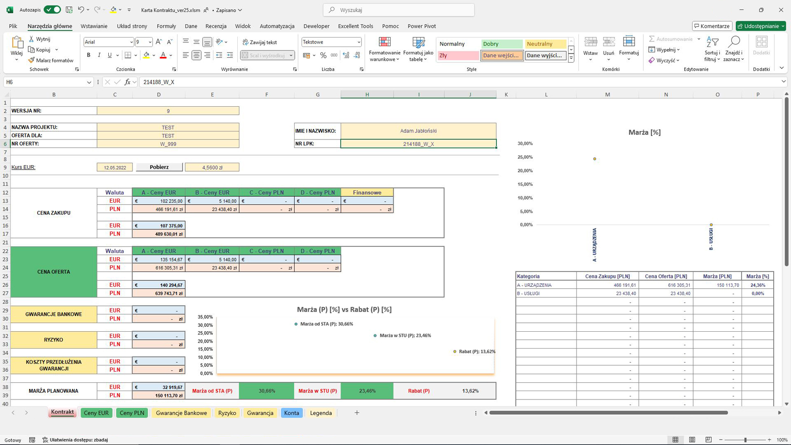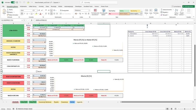 Opracowaliśmy kalkulator kontraktu, który ułatwia negocjacje z klientami i pomaga w podejmowaniu kluczowych decyzji biznesowych. Narzędzie to pozwala na szybkie obliczenia przychodów, kosztów, marż i innych parametrów finansowych, dzięki czemu dział handlowy może precyzyjnie analizować warunki współpracy.